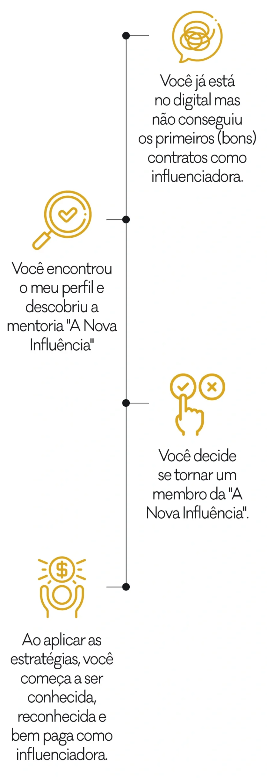 A Nova Influência será um espaço de desenvolvimento de carreira e trocas entre os membros selecionados. Nessa primeira edição, o número de participantes é limitado e por isso, escolhi a dedo as nossas convidadas. Se você está aqui, é porque vejo potencial de evoluir ao meu lado, com o meu direcionamento.